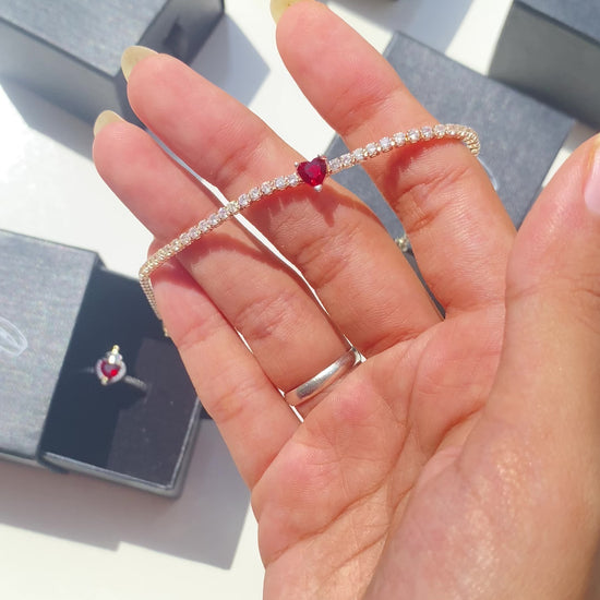 Ignite your style with the Eternal Flame Bracelet, a timeless piece from Pandora crafted in 925 sterling silver. This elegant tennis bracelet is adorned with shimmering stones that capture the light at every angle, while a striking red heart-shaped centerpiece symbolizes passion, love, and devotion.